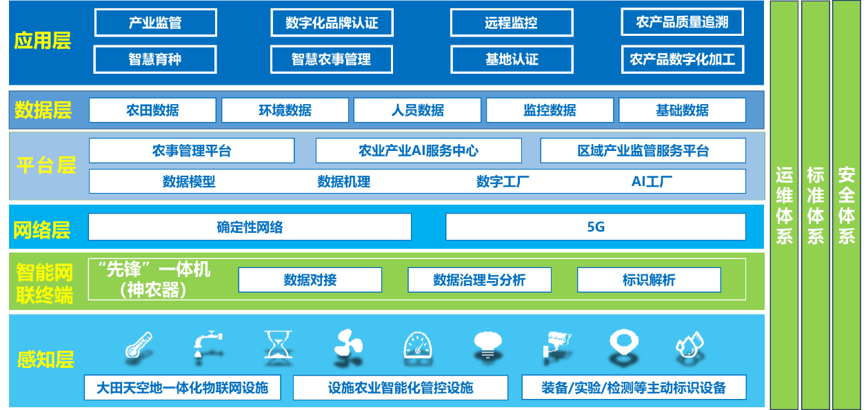 感知层由农业物联网设备组成,采集数据为智慧农业分析决策给予基础服务。智能网联终端主要包含“先锋”一体机智能制造工业物联网平台即神农器。依托网络层确定性网络与5G进行信息的高速稳定传输。数据层包含数字农业智慧决策和应用的数据支撑。PaaS层搭建了农事管理平台、农业AI服务中心、产业监管服务平台等,面向不同用户和不同业务场景给予基础平台。应用层包括智慧育种、智慧种植、数字化品牌认证、远程监控、农产品质量追溯、智慧农事管理、基地认证等应用。